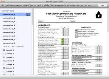 To define preset fields, choose Auto-Fill Empty Grades from the Students option in the Utilities Menu. Select the desired report card from the list of report cards on the left. Now, simply click in the desired field and select a grade. When you are done, click Save to commit the settings.