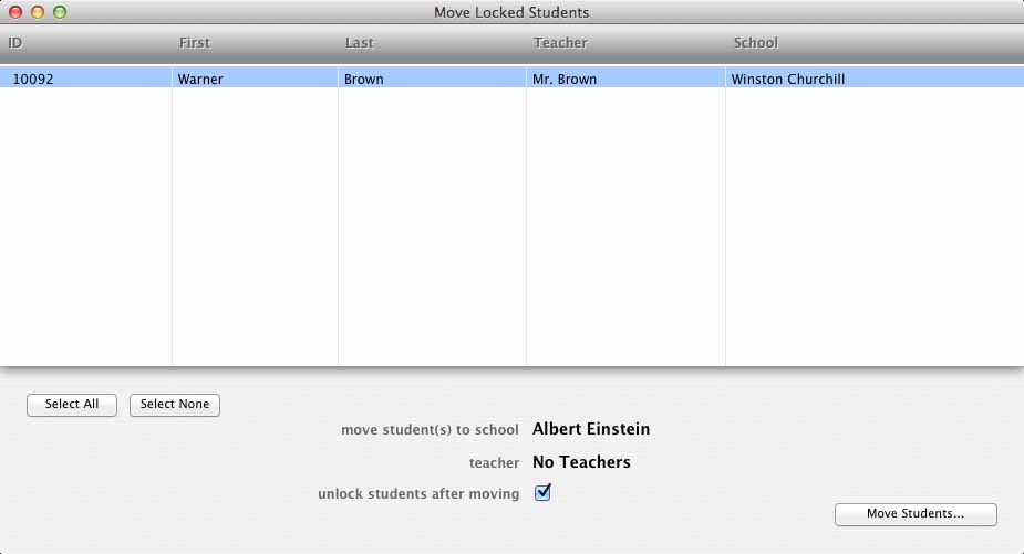 When the Move Locked Students window opens, it will list all students who are currently locked. Select the desired students by clicking their names, or use the Select All or Select None buttons.