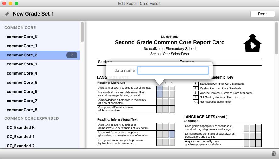 After selecting a Report Card Version, select the report card you want to mark. In general, you will want to mark each version (grade level) of your report card. For example, let's say your working on the Spelling area of your transcript. You would select your Kindergarten card, and select the Spelling areas on the report card. Then select the First grade care and select the Spelling ares on that card. Repeat for each grade level. Then, repeat the process for each Report Card Version (year).