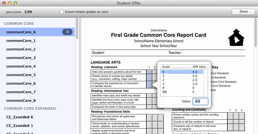 When a field is selected, or you roll your mouse over a selected field, you will see a popup area with the list of possible grades for that grade area. Enter the GPA value for each possible grade. RCM will use these values to calculate the GPA.